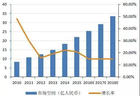 根據(jù)American Imaging Association提供的數(shù)據(jù),全球機器視覺部件及系統(tǒng)市場空間從2010年的25.2億美元增長到2015年的42億美元,年復(fù)合增長率為10.8%。