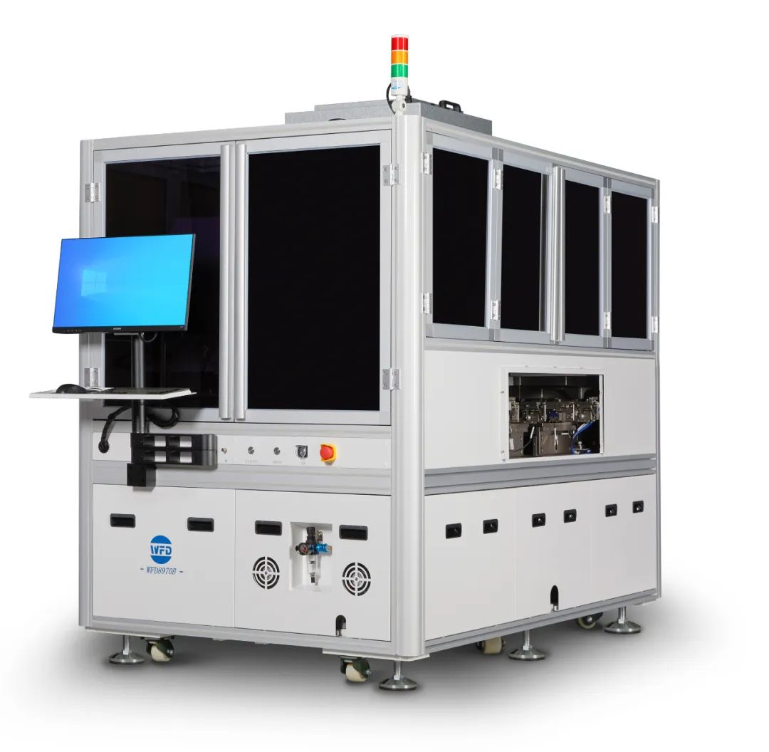 Mini/Micro LED WFD8970B高效率固晶機(jī)是公司本年度最具競爭力的一款機(jī)型,在保證客戶端產(chǎn)品精度及設(shè)備長期工作精度穩(wěn)定的條件下,單臺設(shè)備擁有較高的產(chǎn)能,領(lǐng)先于Mini LED封裝設(shè)備行業(yè)。設(shè)備邦頭擺臂吸嘴帶旋轉(zhuǎn)功能,結(jié)合底部飛拍視覺算法,可對吸取后的芯片進(jìn)行角度精確修正;設(shè)備采用高速、高精度的取晶及固晶平臺,具備真空漏吸晶和XY自動(dòng)修正功能,可識別晶片的R、G、B極性,單臺WFD8970B設(shè)備即可完成單色混打或RGB三色固晶,便于客戶端驗(yàn)證產(chǎn)品及自動(dòng)化聯(lián)線生產(chǎn);自主創(chuàng)新的夾持換晶環(huán)機(jī)構(gòu)(已申請發(fā)明專利),可實(shí)現(xiàn)5S以內(nèi)換一次晶環(huán),提高混打的效率。WFD8970B在基于多約束條件下的高效率混打工藝算法,能很好的解決客戶端產(chǎn)品點(diǎn)亮亮度不均勻的問題。目前,單臺WFD8970B客戶端生產(chǎn)全測有效產(chǎn)能為UPH 75K(開PR、底部飛拍、固后檢測),在編入混打工藝,單機(jī)實(shí)測產(chǎn)能UPH 65K(混打、開PR、底部飛拍、固后檢測),領(lǐng)先同行30K以上,具備較高的性價(jià)比。
